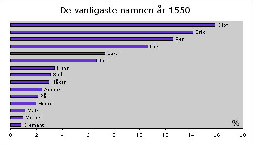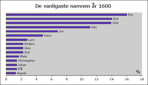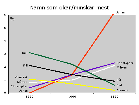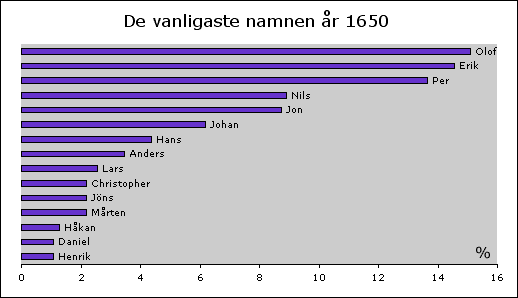 Olof, Erik, Per och Nils har helt klart en särställning. De namnen dominerar vid alla tre tidpunkterna och bärs av ungefär 60% av männen.