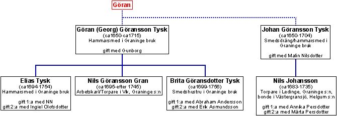 1.1 Göran Göransson Tysk (ca 1650 - ca 1715) Hammarsmed i Graninge bruk [mtl 1688-1715]. Kallas ibland Georg [mtl 1705].